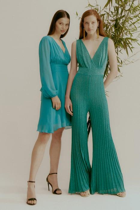 Short Georgette Dress; Plunging Front V-Neck, Concealed Zip Opening In The Centre Back; Long Sleeves With Elastic Cuffs, Tone-On-Tone Sash At The Waist