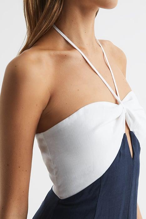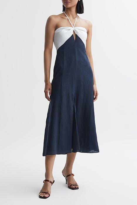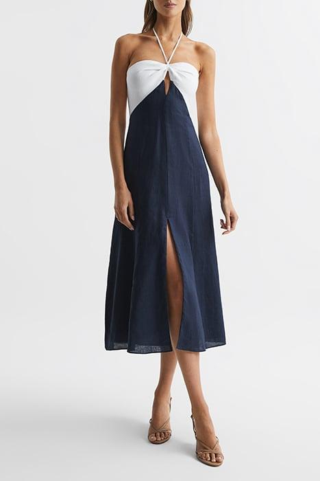The Sian Dress Navy/white is a testament to refined craftsmanship and understated luxury, perfect for those who demand elegance in every detail. Crafted to exude modern charm, it complements any occasion effortlessly.