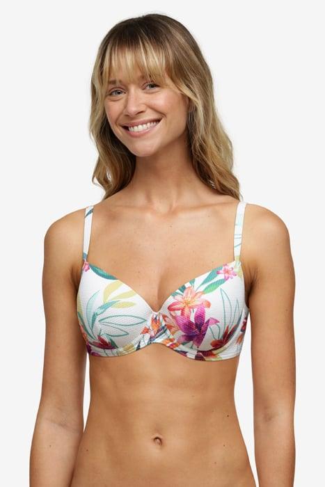A Beautiful Preformed Bracket Bikini Top From The White Paradise Line From Livera. The Cheerful And Summer Print Feels Like That Ultimate Summer Feeling. Create A Unique And Complete Look By Combining This Top With A Bikini Pants From The White Paradise Line From Livera.