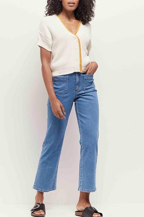 TESS - IVORY CARDIGAN WITH SHORT SLEEVES AND CAMEL TRIM