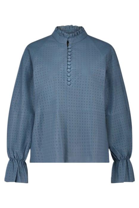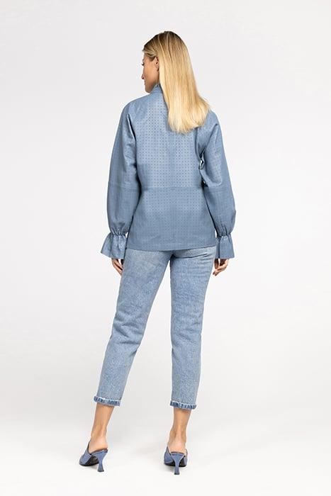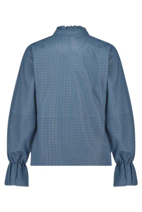 The Blouse With A French Look Due To The High Neck With Gathered Collar. The Blouse Has A Laser-Cut Finish That Is Reminiscent Of Flowers. The Theli Blouse Has A Romantic Button Closure At The Back. The Blouse Is Made Of Buttery Soft Leather For Ultimate Comfort.