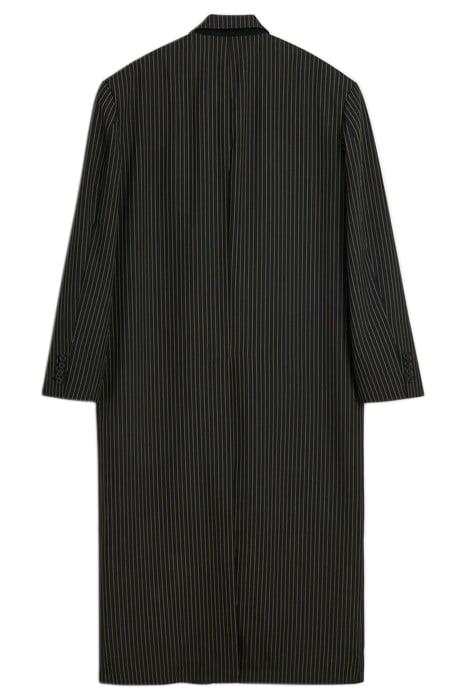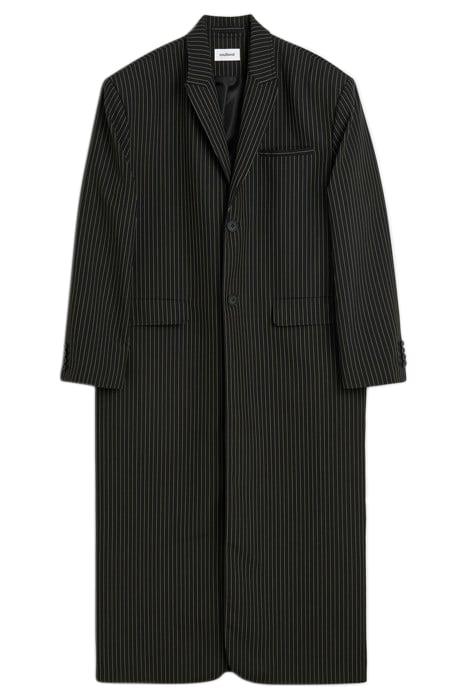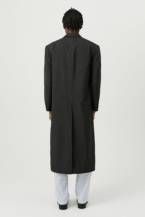 Troy Is An Oversized Fit, Fully Lined Long Coat. Pointed Cut Lapel With Edge Stitch. Two Welted Flap Pockets At The Front And A Small Welt Pocket At The Left Chest. Medium Shoulder Pads. Vent At Back. The Fabric Has A Contrasting Pinstripe
