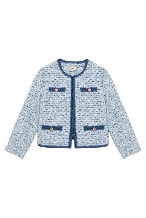 Boxy Short Jacket In Cotton Blend Tweed, Denim Profiles And Faux Breast Pockets, Embellished With Jewel Buttons, Rounded Neckline And Covered Clasp Fastening.