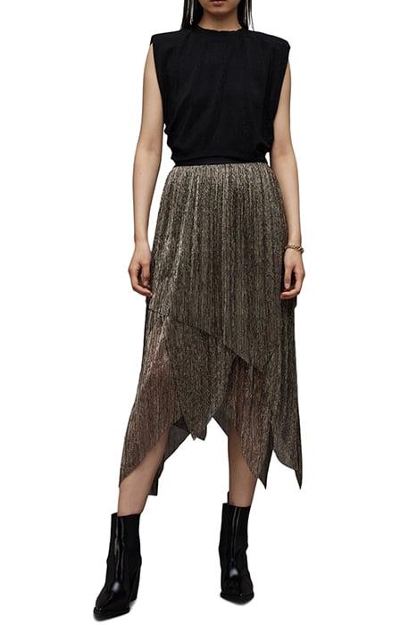 Veena Skirt Black Gold. Perfect for layering or standing out on its own, this Brown Midi Skirt is the definition of understated luxury. A key addition to any wardrobe, this piece is designed for those who seek effortless style.