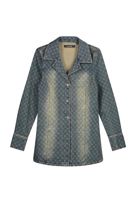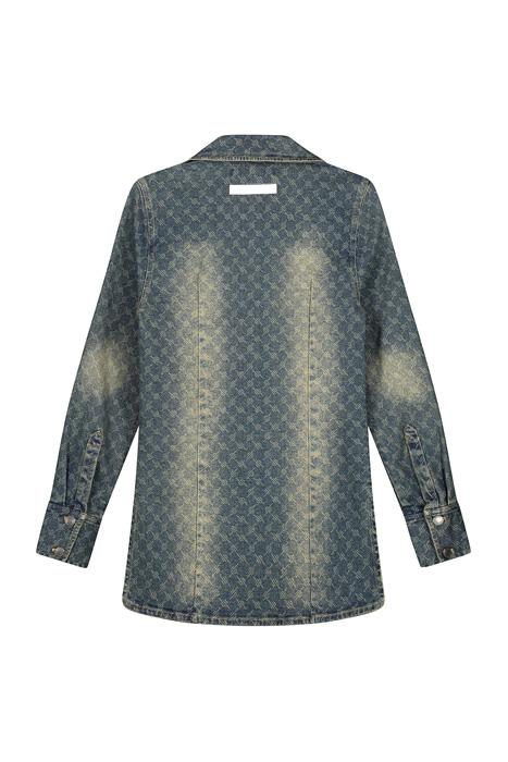 Workwear meets shirting, this form-fitting denim jacket has been tailored with a tapered waist and open lapels. The dark vintage washed denim features our custom monogram print laser engraved on its surface for a luxury fashion house finish. Comes with authentic Daily Paper branded metal jean buttons at the front and cuff and a small polyurethane label at the back and contrast warm yellow thread stitching.