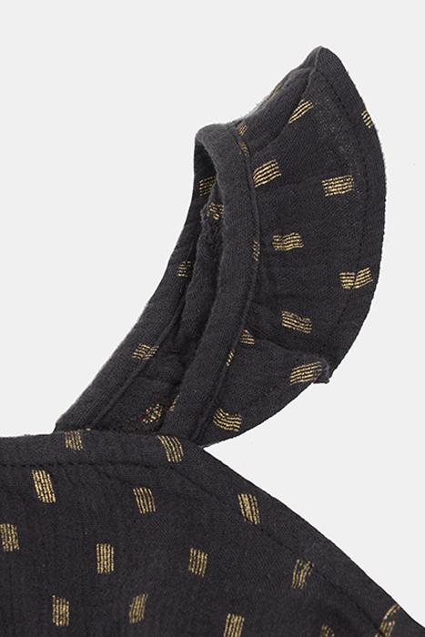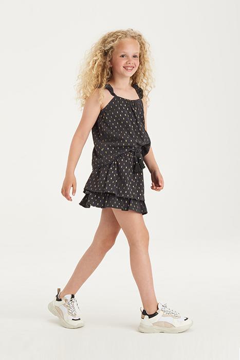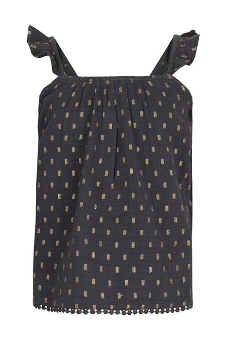 Joie De Vivre! Het Vivre Topje Heeft Een Rechte Hals, Een Rechte Fit En Bandjes Met Schattige Ruffles. Het Item Wordt Gekenmerkt Door De Donkergrijze Kleur En De Gouden Streepjes All-Over. Een Leuk Detail Is Het Geborduurde Randje Onderaan De Top. Combineer De Top Met Het Bijpassende Rokje En Sandalen En Je Kleine Meid Is Ready To Go!