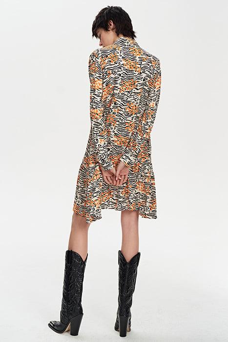 Short Loose Fit Dress With Volant Hem And Bottom Closure Collar, Long Sleeves With Buttom-Closure Sleeve Cuffs.