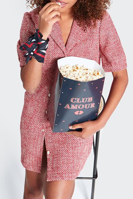 Winter Crimson Straight Dress . Suit Collar, Slightly Puffed Short Sleeves . 2 Patch Front Pockets . Tweed-Look Fabric With Metallic Fibre . Buttons Down Front To Fasten, Ic Signature Button . Length: 86 Cm.