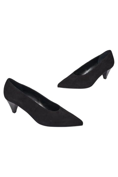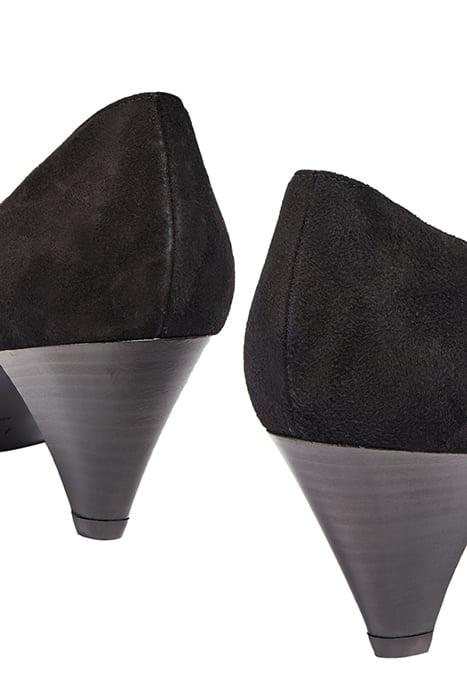 The Zayla courts are crafted in Italy from black suede. They have a pointed toe, a top stitch centre seam and a 50mm black stacked cone heel.